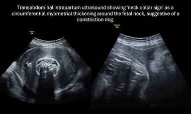 New UOG Journal videoclip on a novel sonographic sign of labor arrest, the 'neck collar sign': a peculiar myometrial thickening around the fetal neck, suggestive of a constriction ring.
